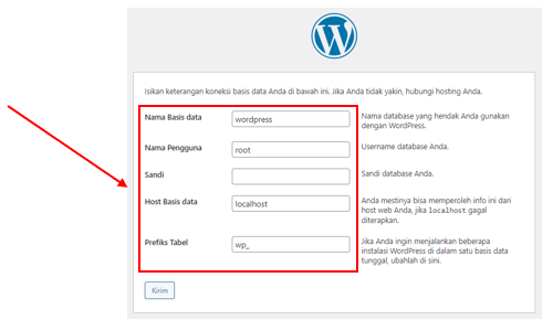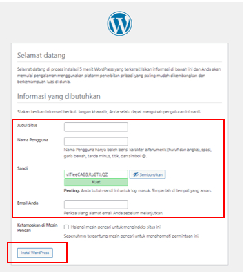 11. Isikan detail input pemasangan WordPress. Tidak berbeda jauh dengan input pemasangan pada hosting. Kemudian klik Instal WordPress.