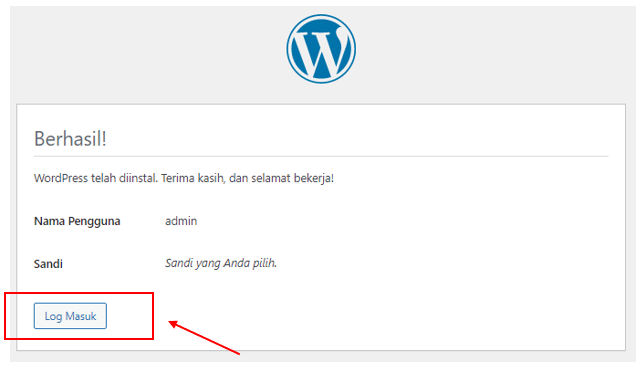 12. WordPress berhasil di install, Klik log Masuk untuk masuk laman login WordPress